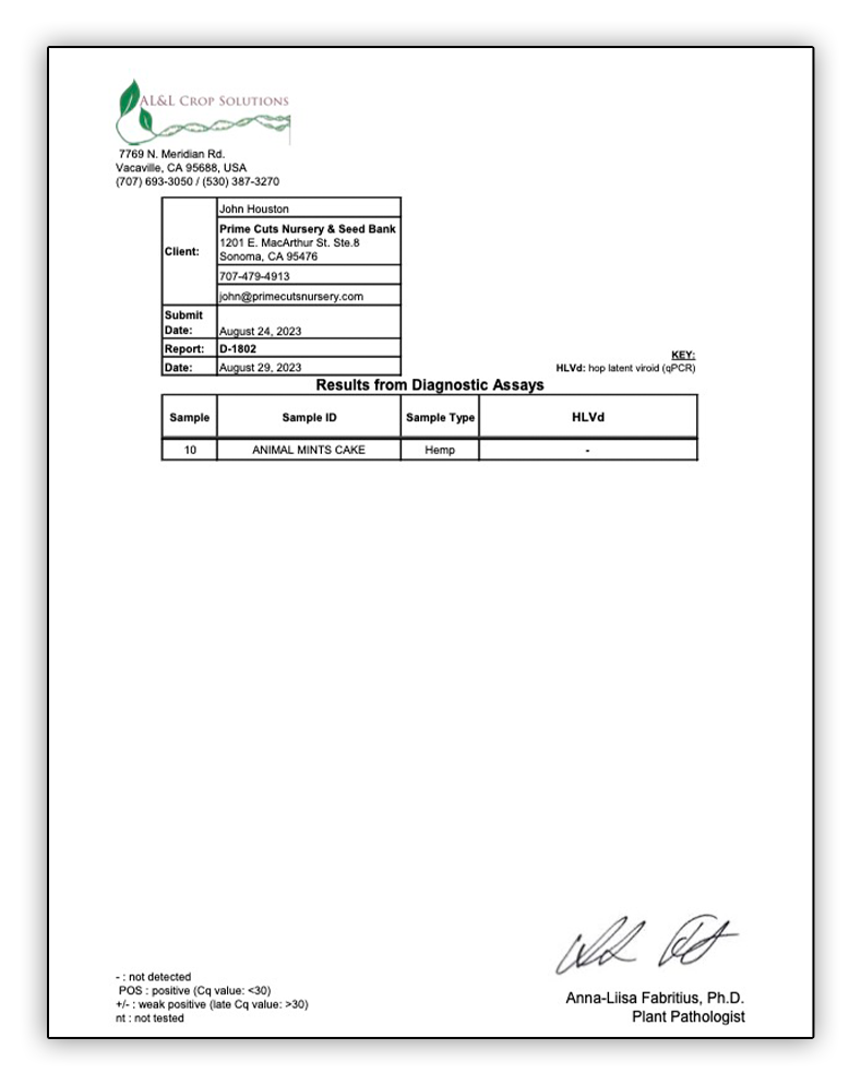 Prime Cuts Nursery’s Standard Operating Procedures are designed to protect our customers from Hops Latent Viroid (Hplvd). This includes a multi-stage, quarantine and frequent lab testing of both leaf patiole and root tissue samples using AL&L Agricultural Labs. Recent test results are available upon request.