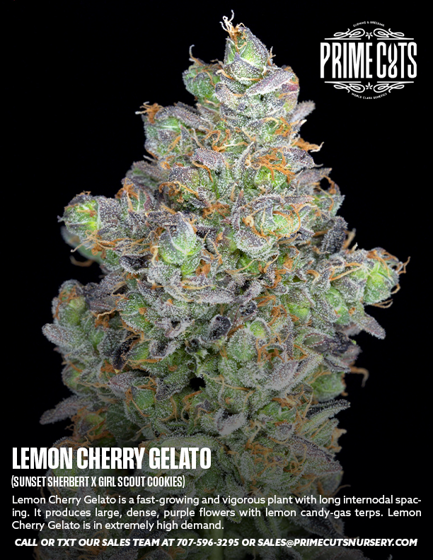 Lemon Cherry Gelato is a fast-growing and vigorous plant with long internodal spacing. It produces large, dense, purple flowers with lemon candy-gas terps. Lemon Cherry Gelato is in extremely high demand.