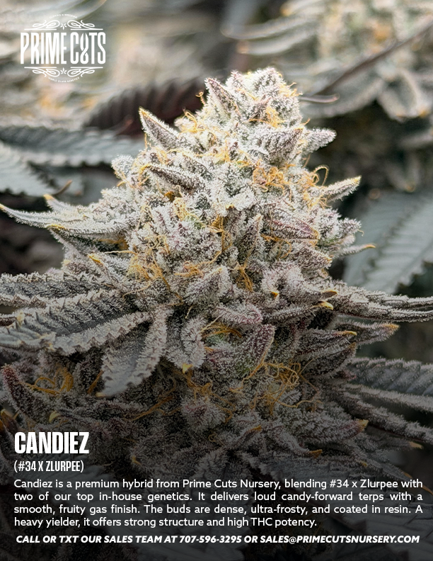 Candiez is a premium hybrid from Prime Cuts Nursery, blending #34 x Zlurpee with two of our top in-house genetics. It delivers loud candy-forward terps with a smooth, fruity gas finish. The buds are dense, ultra-frosty, and coated in resin. A heavy yielder, it offers strong structure and high THC potency.